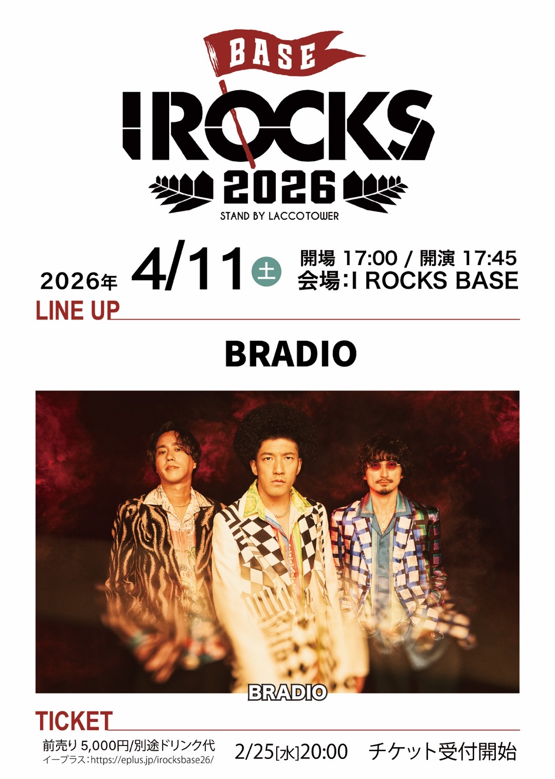 04.11SAT.2026 EVENTUP I ROCKS 2026[BASE編]|群馬 会場群馬県・I ROCKS BASE OPEN/START17:00 / 17:45 actBRADIO TICKET¥5,000 (1ドリンク代別途必要) プレイガイドe+ プレオーダー(抽選):2/25(木)20:00〜3/1(日)23:59まで一般発売(先着):3/8(日) 10:00〜 INFORMATIONアイロックス:info@irocks.jp ツイート シェア 送る